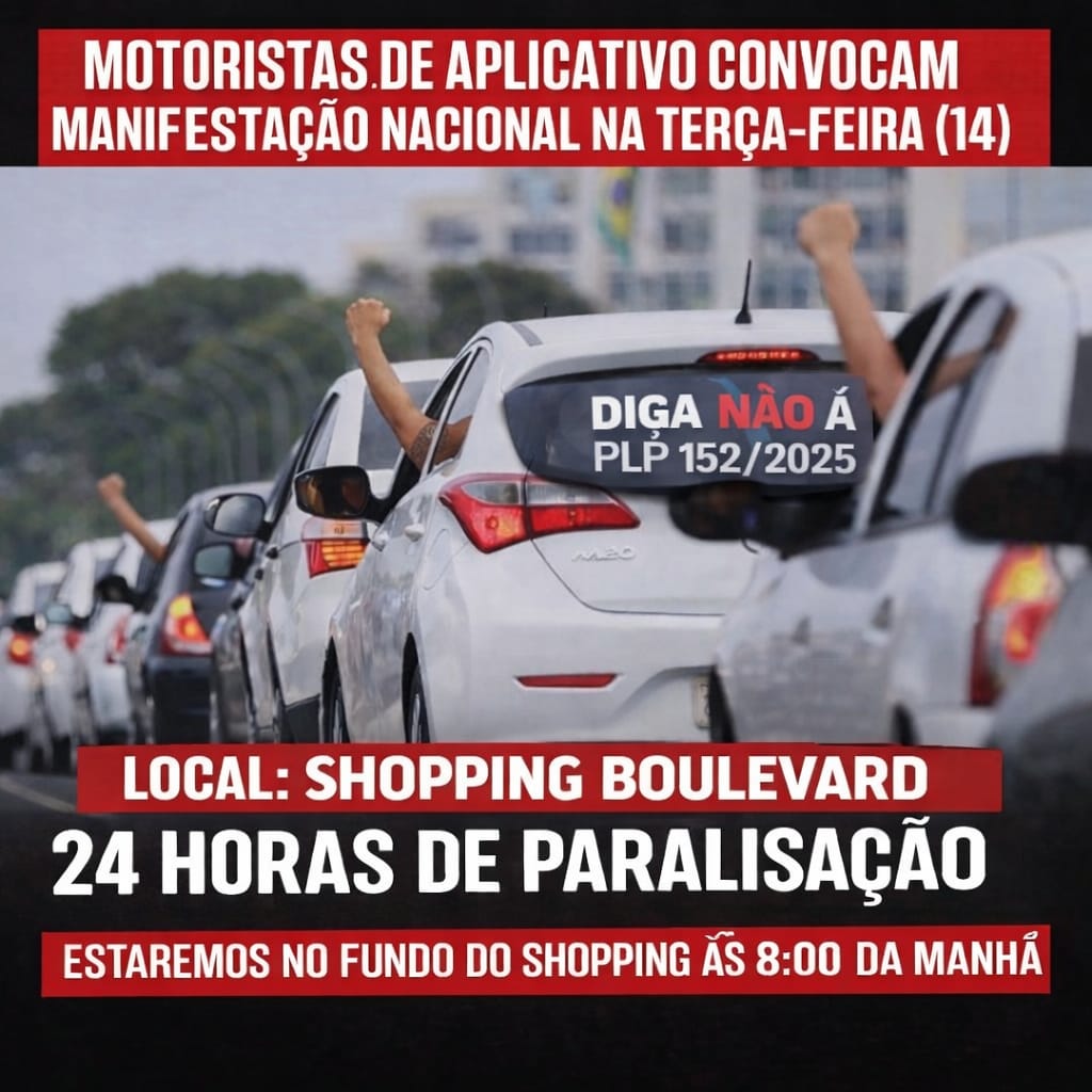 Os motoristas de transporte por aplicativo estão se mobilizando em todo o país para uma manifestação e paralisação nacional marcada para a próxima terça-feira (14). Em Vitória da Conquista, a categoria vai aderir fortemente ao movimento realizando 24 horas de paralisação, com ponto de encontro e concentração marcado para as 8h da manhã, na área localizada aos fundos do Shopping Boulevard.
