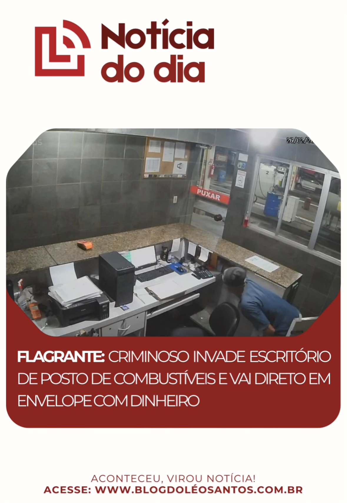 As câmeras de segurança de um posto de combustíveis registraram uma ação criminosa rápida e muito específica na madrugada desta quinta-feira, 26 de fevereiro. Um indivíduo invadiu o escritório do estabelecimento e furtou um envelope contendo dinheiro, chamando a atenção pela precisão da sua conduta.