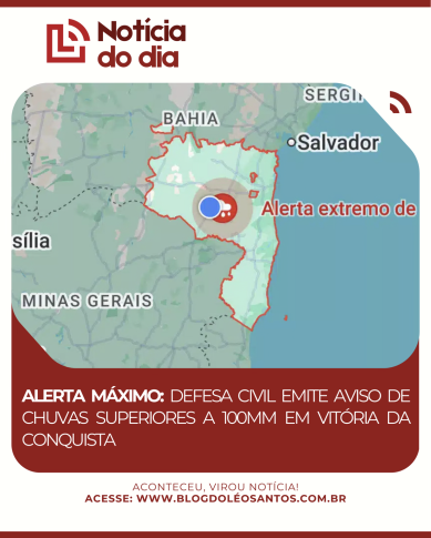 A Defesa Civil do Governo da Bahia acaba de emitir um comunicado urgente para Vitória da Conquista. O alerta, que começou a valer na manhã desta sexta-feira (27), aponta para um volume de chuva extremamente alto, podendo ultrapassar os 100 mm por dia ou 60 mm por hora.