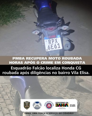 Policiais militares do Esquadrão de Motociclistas Falcão recuperaram uma motocicleta roubada na noite deste domingo (8), no bairro Vila Elisa, em Vitória da Conquista. (mais…)