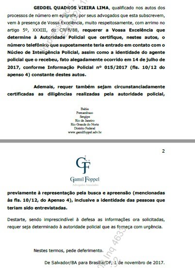 Em petiçao direcionada ao ministro Edson Fachin, do Supremo Tribunal Federal, o advogado Gamil Foppel, que defende Geddel, solicita que a PF informe qual foi “o número telefônico que supostamente teria entrado em contato com o Núcleo de Inteligência Policial, assim como a identidade do agente policial que o recebeu, fato alegadamente ocorrido em 14 de julho de 2017”.