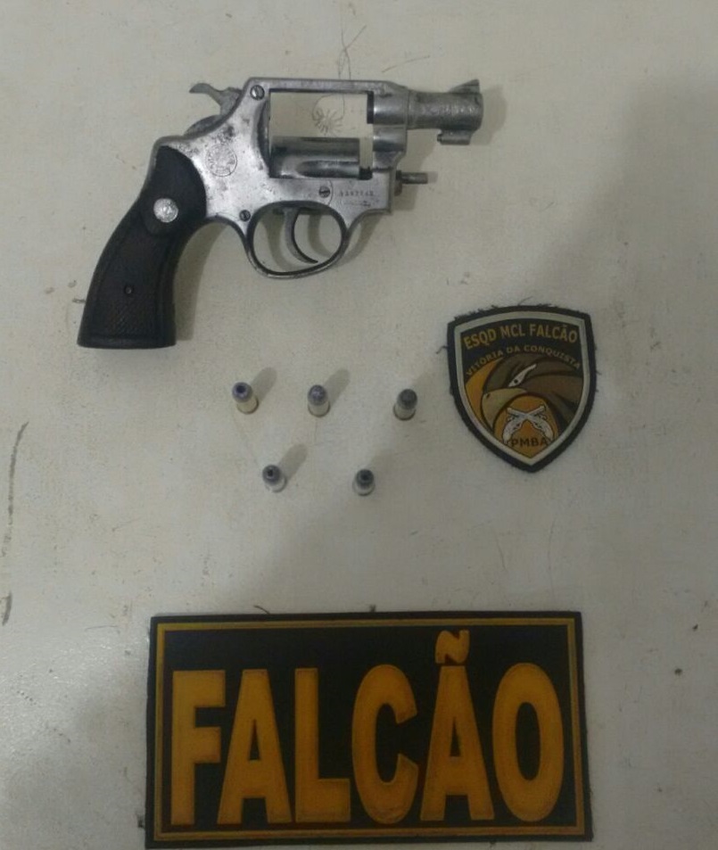 Ao proceder com abordagem, na cintura do individuo foi encontrado um revólver calibre .38 municiado.