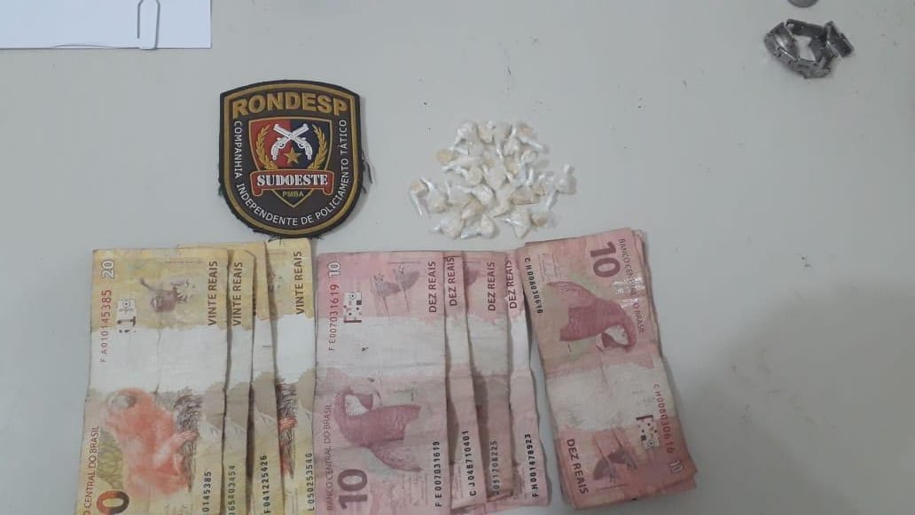 A guarnição deslocou para averiguar a veracidade da denúncia, localizando o indivíduo com as mesmas características informadas próximo a Lagoa das Bateias que ao realizar busca pessoal no indivíduo foi encontrado com o mesmo a quantia de R$156,00, sendo que o mesmo não soube informar a procedência do dinheiro e que ao realizar buscas no terreno onde o indivíduo se encontrava foi encontrada uma lata com 26 pedras de substâncias análogas a crack. Sendo q o mesmo confessou ser ele o proprietário do material encontrado. Diante dos fatos o mesmo foi conduzido a Delegacia de Polícia desta cidade para ser tomadas as medidas cabíveis.