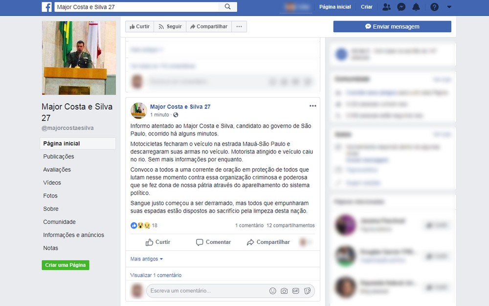 Em post no perfil do candidato no Facebook, mensagem informa que “motocicletas fecharam o veículo na estrada Mauá-São Paulo e descarregaram suas armas no veículo”.