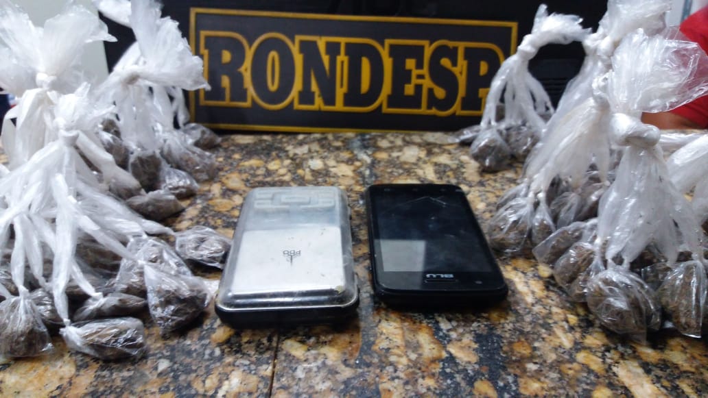 Chegando no logradouro informado, o denunciado fora encontrado e após ser realizada busca pessoal fora encontrada 10 buchas de maconha em posse do mesmo. Após ser interpelado o mesmo informou existia outra quantidade num terreno baldio em frente a residência num monte de areia. Procedida busca no local apontado pelo denunciado fora encontrada uma quantidade significativa de buchas de maconha acondicionadas dentro de uma sacola plástica juntamente com uma balança de precisão. Diante do exposto todo material encontrado, bem como o indivíduo quem tinha posse das drogas foram apresentados na delegacia competente para que fossem adotadas as medidas coercitivas cabíveis.