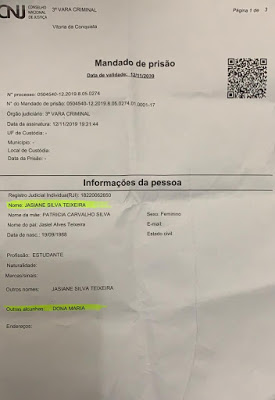 Após ter o pedido e soltura indeferido pela Justiça, Jasiane Silva Teixeira, vulgo Dona Maria, teve mais um mandado de prisão preventiva acatado pelo judiciário baiano.A prisão foi representada pela Polícia Civil, através da DTE/ DRACO e decretada pela 3ª Vara Criminal de Vitória da Conquista.