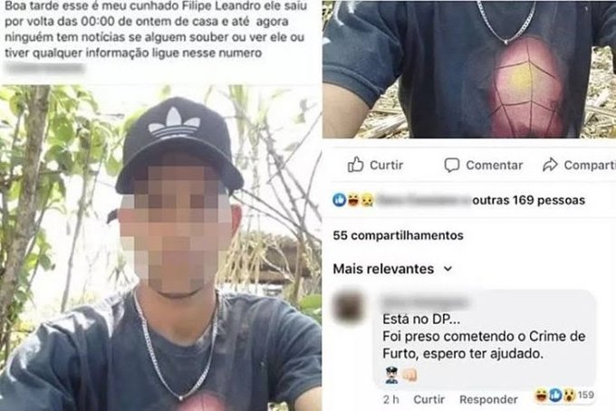 Familiares pediram ajuda nas redes sociais para encontrar um jovem que estava desaparecido. Depois da publicação, feita pelo cunhado, eles descobriram que o rapaz estava, na verdade, preso por furto. Isso por que um policial militar deixou um comentário no post. As informações são do G1. (mais…)