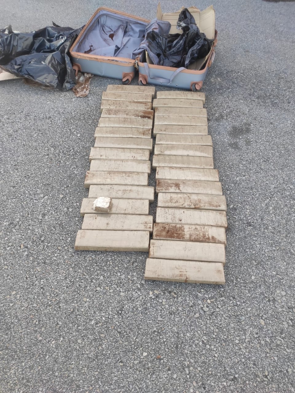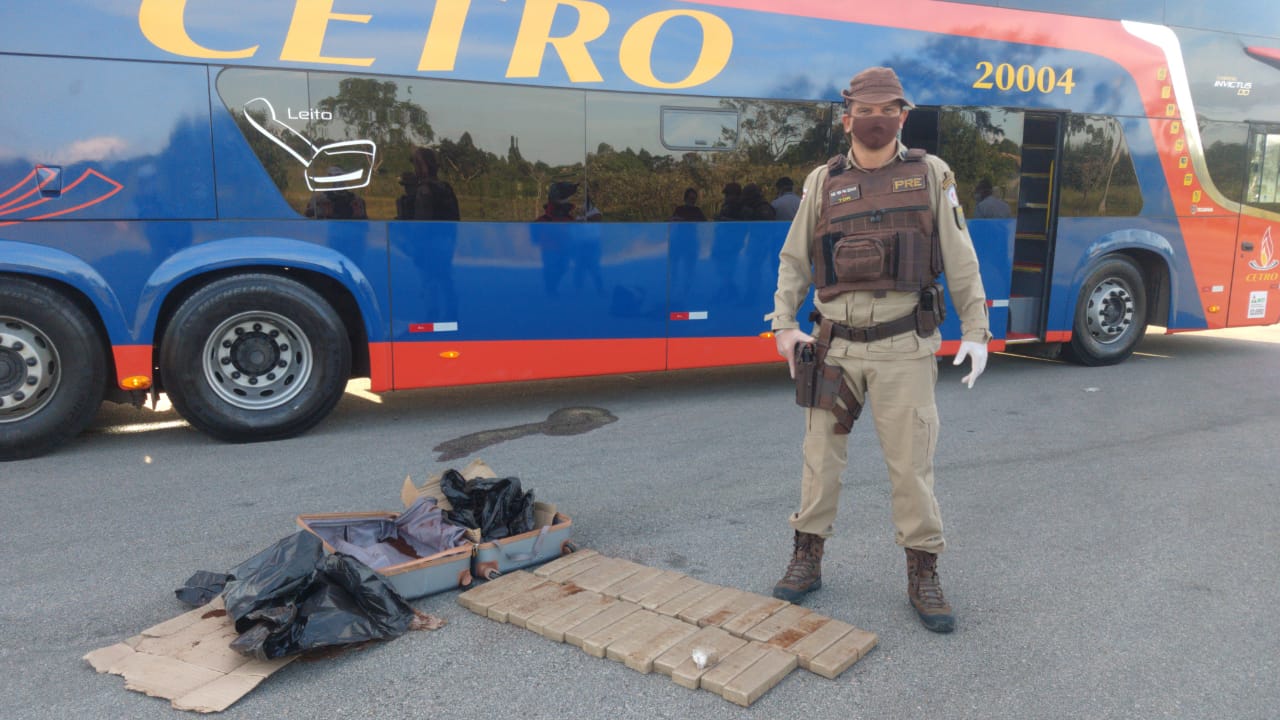 Nesse momento, a foi solicitada que apresentasse sua bagagem para verificação, quando foi apresentada e verificada uma mala de cor cinza de propriedade da abordada. Ao verificar seu interior, constatou que se tratava de 29 tabletes de substância análoga a MACONHA, embaladas em plásticos e cobertas por pó de café.