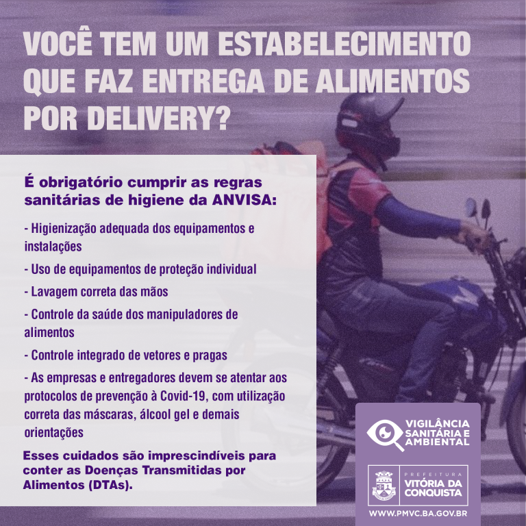 Segundo as normas da Resolução da Diretoria Colegiada (RDC) nº. 216/2004, da Agência Nacional de Vigilância Sanitária (Anvisa), restaurantes, lanchonetes, pizzarias, trailers, padarias e outros similares devem seguir regras higiênico-sanitárias, como: higienização adequada dos equipamentos e instalações, uso de equipamentos de proteção individual, lavagem correta das mãos, controle de saúde dos manipuladores, controle integrado de vetores e pragas, dentre outros. Esses cuidados são imprescindíveis por conter a transmissão das Doenças Transmitidas por Alimentos (DTAs). Além disso, as empresas e entregadores devem se atentar aos protocolos de prevenção à Covid-19, com utilização correta das máscaras, álcool gel e demais orientações.