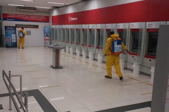 Neste período de pagamento do auxílio emergencial, as agências bancárias têm recebido atenção especial. A solução de hipoclorito de sódio fornecida pela empresa Teiú é aplicada na fachada das agências, calçadas e locais de manuseio, como portas e barras de ferro. “Estamos atuando na limpeza e, junto à Secretaria de Saúde e outros setores da Prefeitura, fiscalizando constantemente os estabelecimentos”, declarou o secretário da pasta, Luís Paulo Santos.