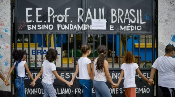 Abraço coletivo, dias após o crime, em março de 2019, no prédio da escola estadual Raul Brasil, em Suzano