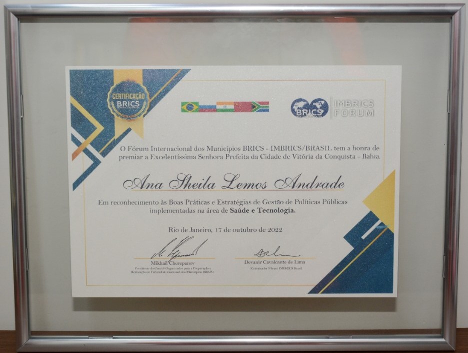 A prefeita de Vitória da Conquista foi a única gestora do Nordeste a receber do Fórum Internacional dos Municípios Brics (Imbrics Forum) o prêmio Boas Práticas e Estratégias de Gestão de Políticas Públicas, pelo desempenho da Prefeitura na área de Saúde e Tecnologia. O Brics é o grupo econômico formado por Brasil, Rússia, Índia, China e África do Sul e a premiação aconteceu em outubro, no Rio de Janeiro (RJ)m com o objetivo disseminar iniciativas que gerem valor para a administração pública e para a sociedade.