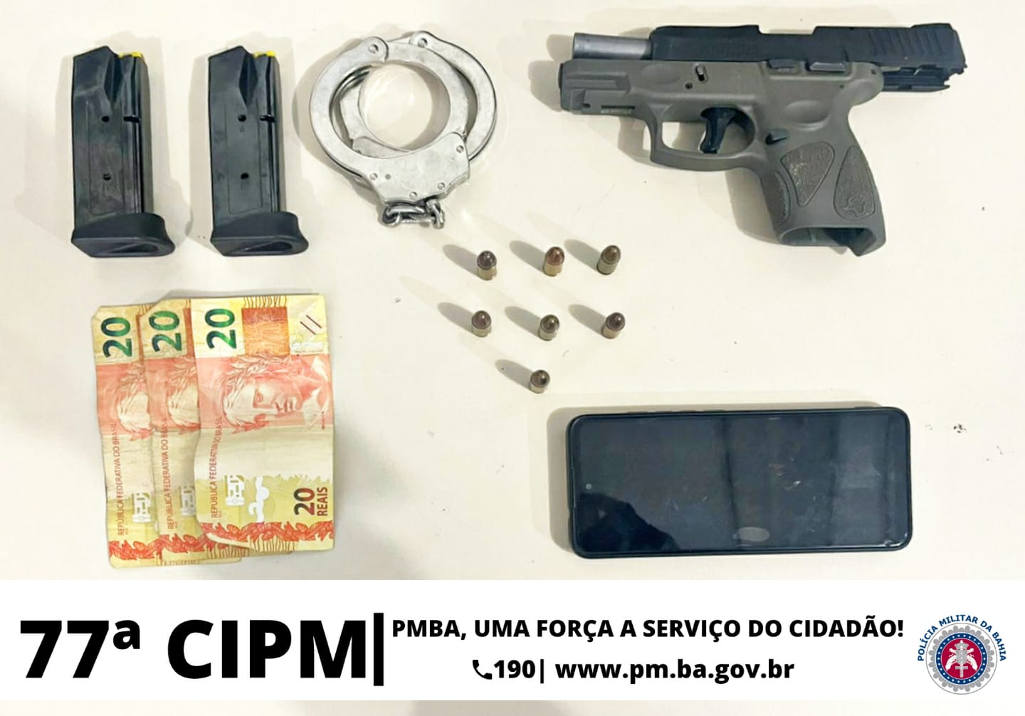 Por volta de 12:00, a GU foi acionada pelo Cicom para averiguar uma situação de suspeitos armados a bordo de um Classic azul, os quais foram avistados no pátio do posto Macaubense, às margens da BR-116, após localizar o veículo citado abandonado e com as portas abertas, a GU fez a abordagem, encontrando no interior do carro uma sacola contendo três (3) tabletes de substância análoga a pasta-base de cocaína, não havendo nenhum ocupante no veículo, a GU empreendeu rondas nas imediações a fim de localizar os suspeitos, porém sem susseso. Diante disso, a GU apresentou o material apreendido juntamente com o veículo de placa policial: PJJ5A97, ao Disep para as medidas cabíveis.