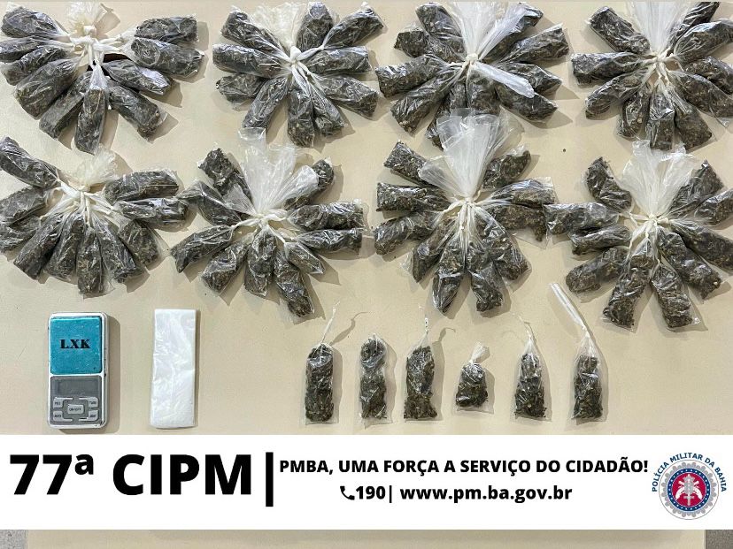 Por volta das 12h30 horas deste sábado (17/02), uma guarnição do PETO Motos da 77ª CIPM, recebeu denúncia via CICOM (190), de que um homem estaria praticando tráfico de drogas bairro Vila América, em Vitória da Conquista. Durante rondas, um indivíduo com as mesmas características informadas, ao perceber a presença policial, mudou abruptamente de direção e tentou evadir, sendo prontamente alcançado. Em sua posse foram encontradas 86 porções de substâncias análogas à maconha, embalagens para acondicionamento da droga e balança de precisão. Diante dos fatos, o nacional, juntamente com o material apreendido, foi conduzido ao DISEP, onde a ocorrência foi registrada.