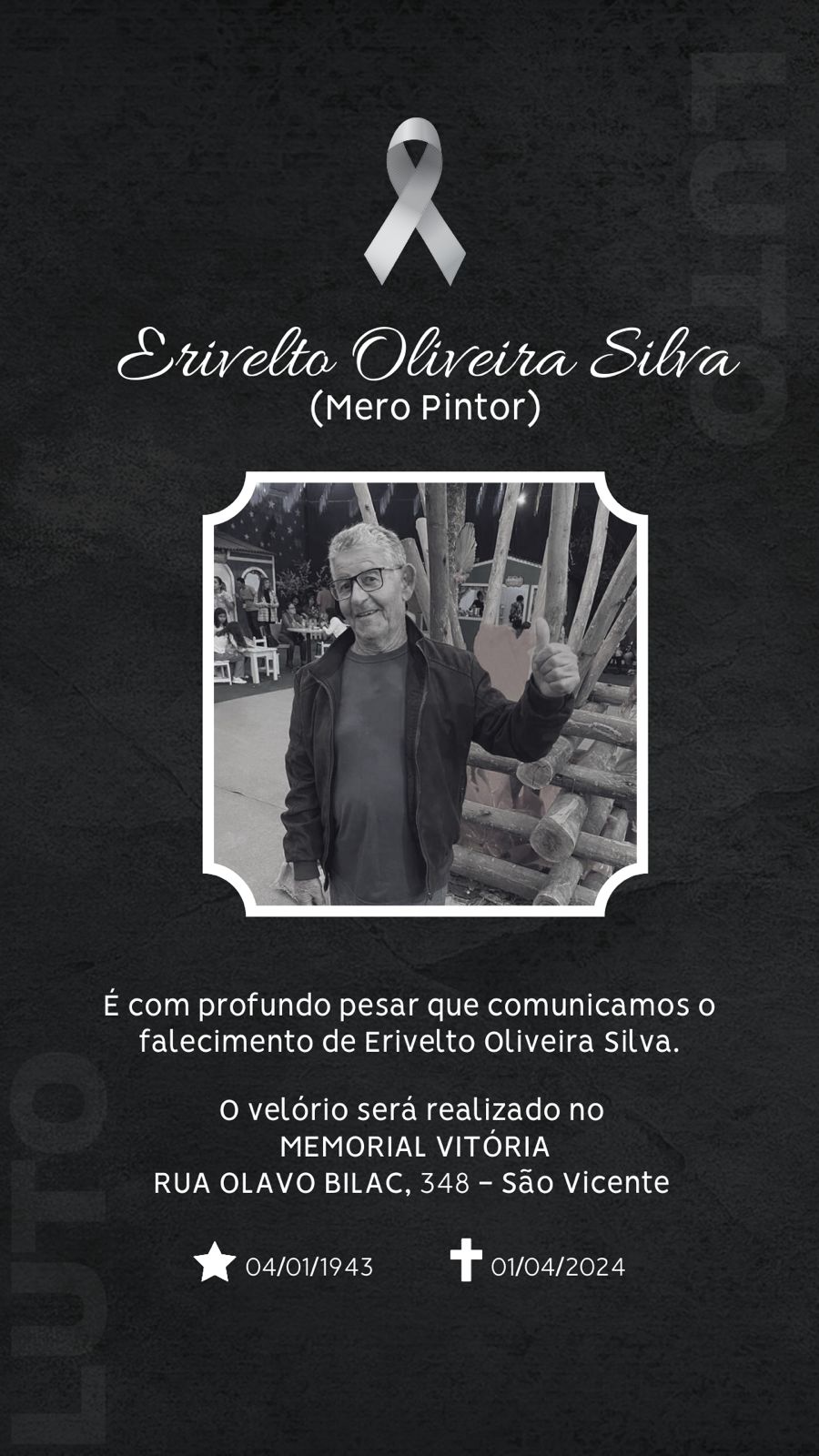 Blog do Léo Santos comunica o falecimento do senhor Erivelto Oliveira Silva aos 81 anos, ocorrido na noite desta segunda-feira (01), em decorrência de problemas de saúde em Vitória da Conquista.