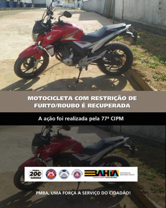 Na manhã deste sábado, 07 de junho, por volta das 08h, durante rondas no bairro Morada Real, em Vitória da Conquista, uma Guarnição da 77ª CIPM localizou uma motocicleta suspeita em um terreno baldio.