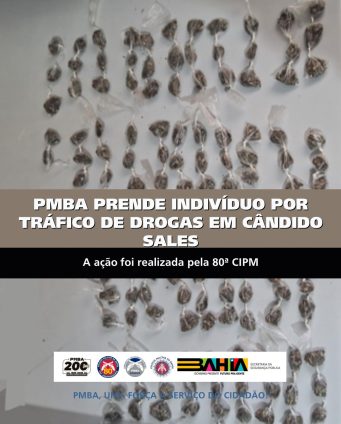 Em data de 23/06, por volta das 11h na cidade de Cândido Sales, a guarnição do PETO realizava rondas, quando percebeu um indivíduo evadindo em atitude suspeita, após visualizar a viatura. Da abordagem foram encontradas em posse do acusado 25 invólucros de substância análoga a maconha. Dando continuidade a diligência, verificou-se que o conduzido possuia ao todo 119 invólucros de substância análoga a maconha. Conduzido e material apreendido foram apresentados no DISEP.