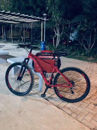 A bicicleta, de cor vermelha, é o ganha-pão da vítima. Uma foto do veículo mostra a bolsa térmica de entregas acoplada, evidenciando que o furto representa um prejuízo enorme.