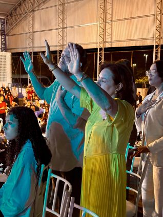 Desde a chegada, a energia era contagiante. Famílias inteiras, grupos de jovens e caravanas de cidades vizinhas formavam um mosaico de fé que pulsava em um só ritmo. O som das primeiras canções, entoadas pela voz ungida da cantora Anna Clara, não ficou restrito ao palco; ele ecoou em um coro potente formado por cada pessoa presente. Mãos erguidas, vozes em uníssono e uma expressão de entrega genuína no rosto de muitos transformaram o ginásio em um grande santuário a céu aberto.