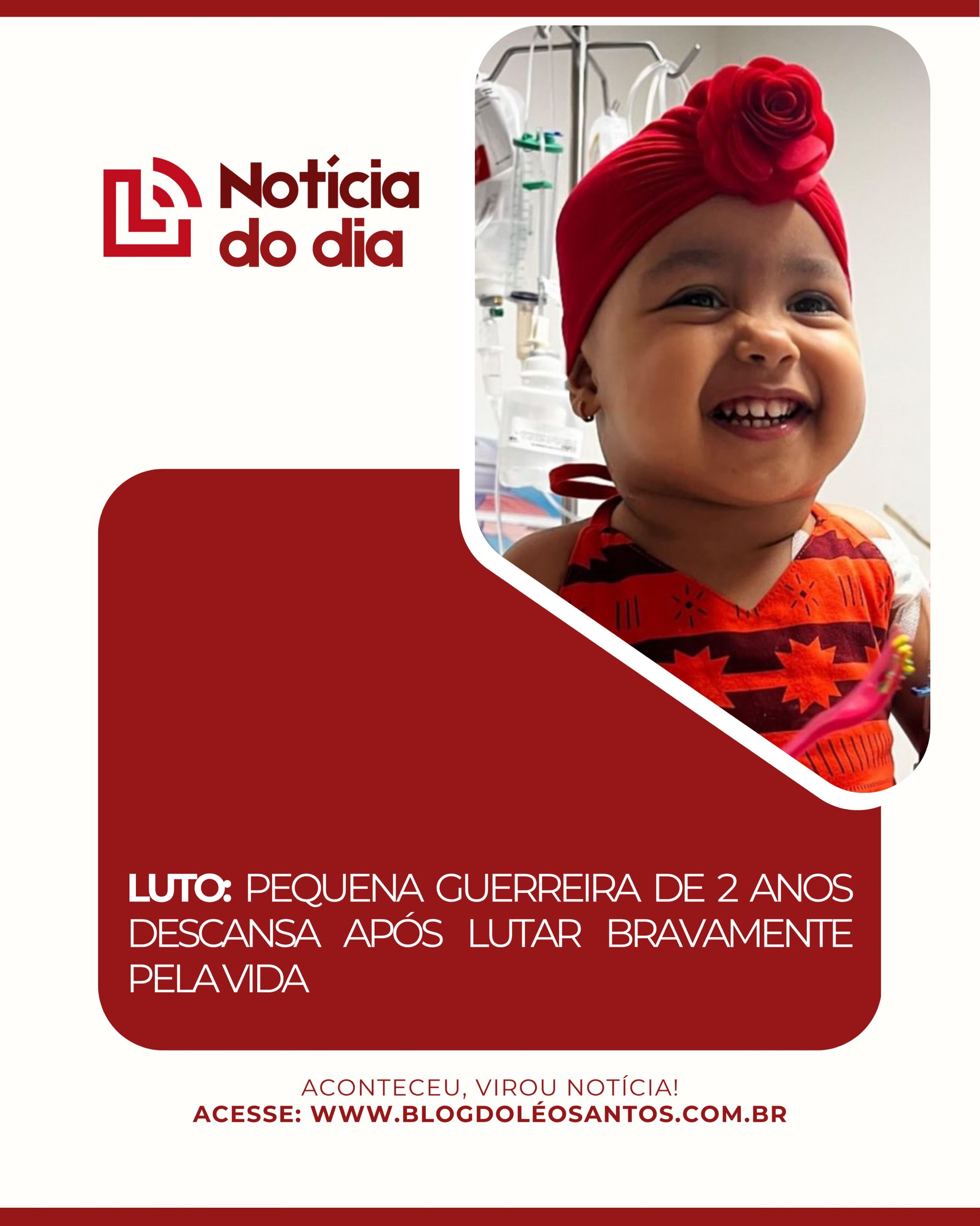 É com imensa tristeza que o Blog do Léo Santos comunica o falecimento de uma pequena e preciosa guerreira de apenas 2 anos, ocorrido neste domingo (26). A criança, cujo sorriso encantador tocou a todos que a conheceram, partiu devido a complicações de saúde.