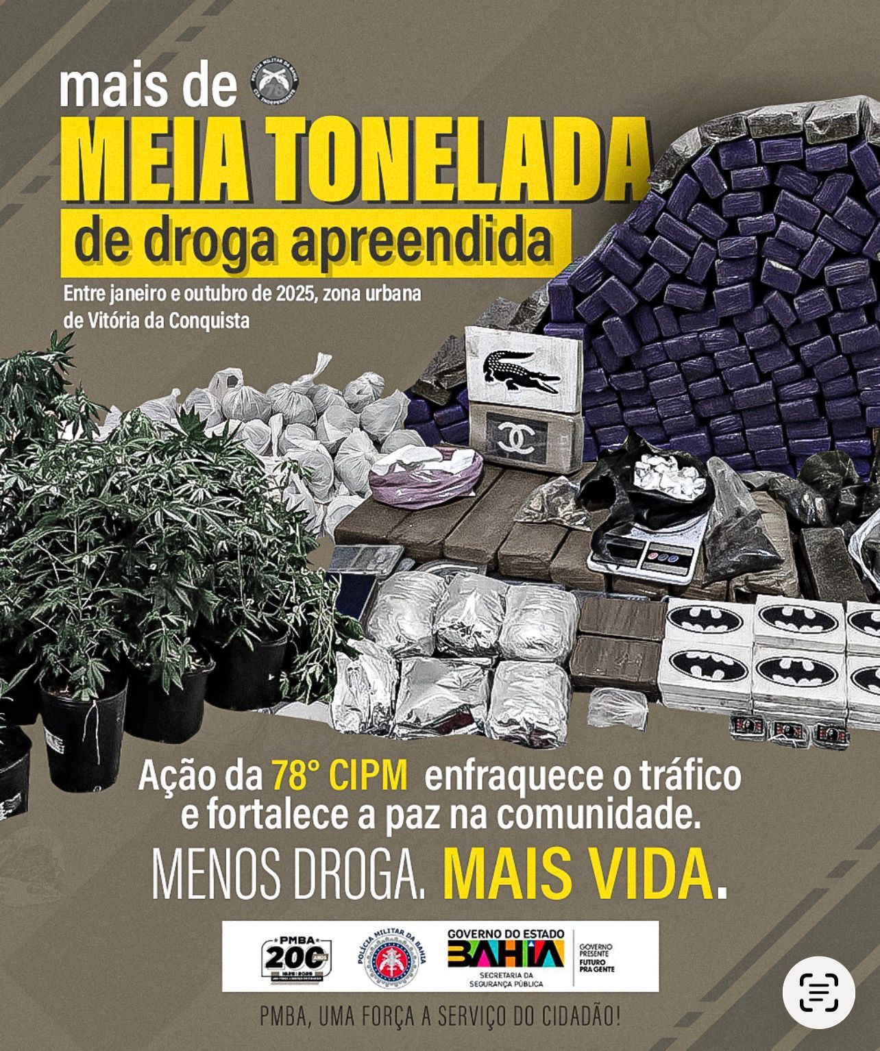 A 78ª Companhia Independente de Polícia Militar (CIPM) divulgou um balanço impressionante de suas ações de combate ao crime em Vitória da Conquista. Entre janeiro e outubro de 2025, a unidade retirou de circulação mais de meia tonelada de entorpecentes na Zona Oeste do município.