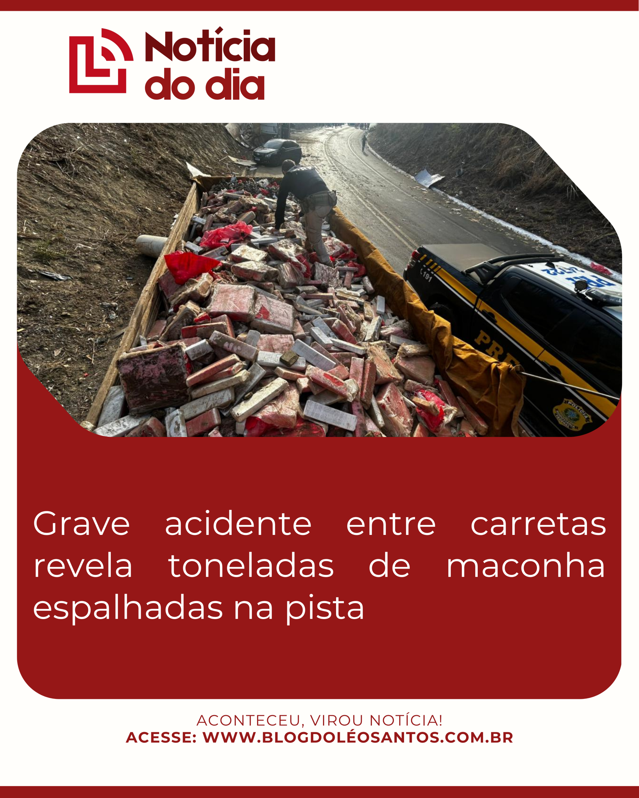 Um grave acidente envolvendo duas carretas na noite desta sexta-feira (17) revelou uma cena impressionante: toneladas de maconha espalhadas pela pista. A colisão ocorreu na rodovia MG-251, em uma região próxima a Salinas, no norte de Minas Gerais.