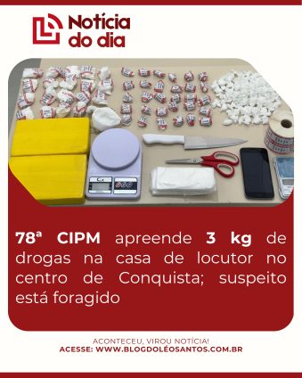 A 78ª Companhia Independente de Polícia Militar (CIPM) apreendeu cerca de 3 kg de drogas na manhã desta quinta-feira (16), em uma residência no centro de Vitória da Conquista. O imóvel pertence a um locutor que atua na cidade, conhecido pelo apelido de “Traquinão”, que conseguiu fugir antes da chegada da polícia e agora é considerado foragido.