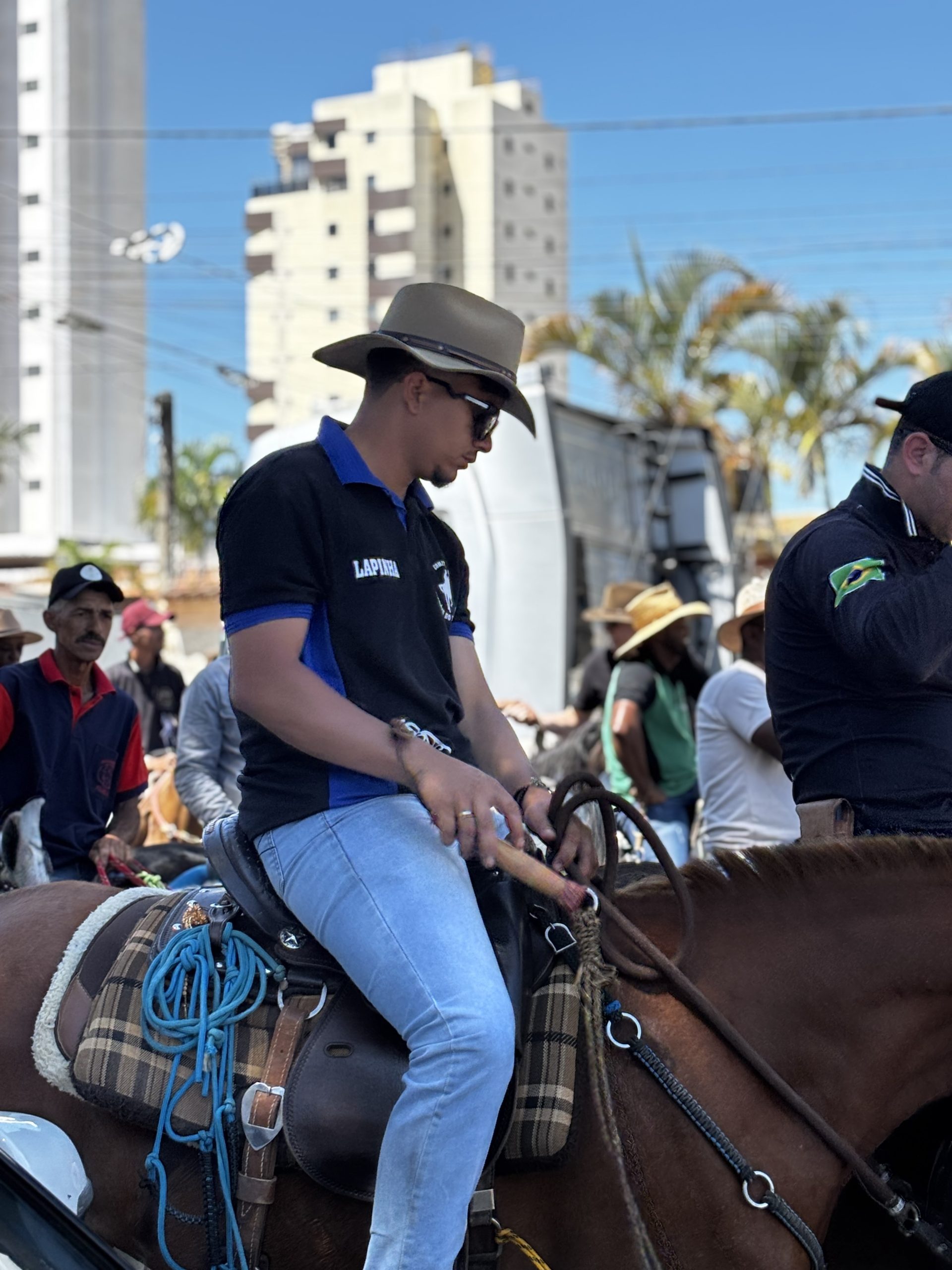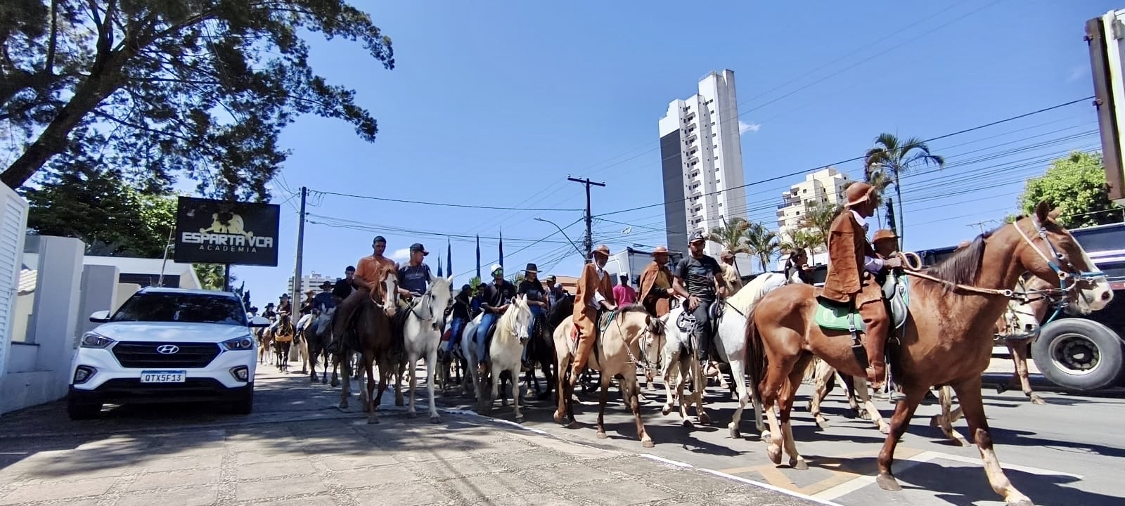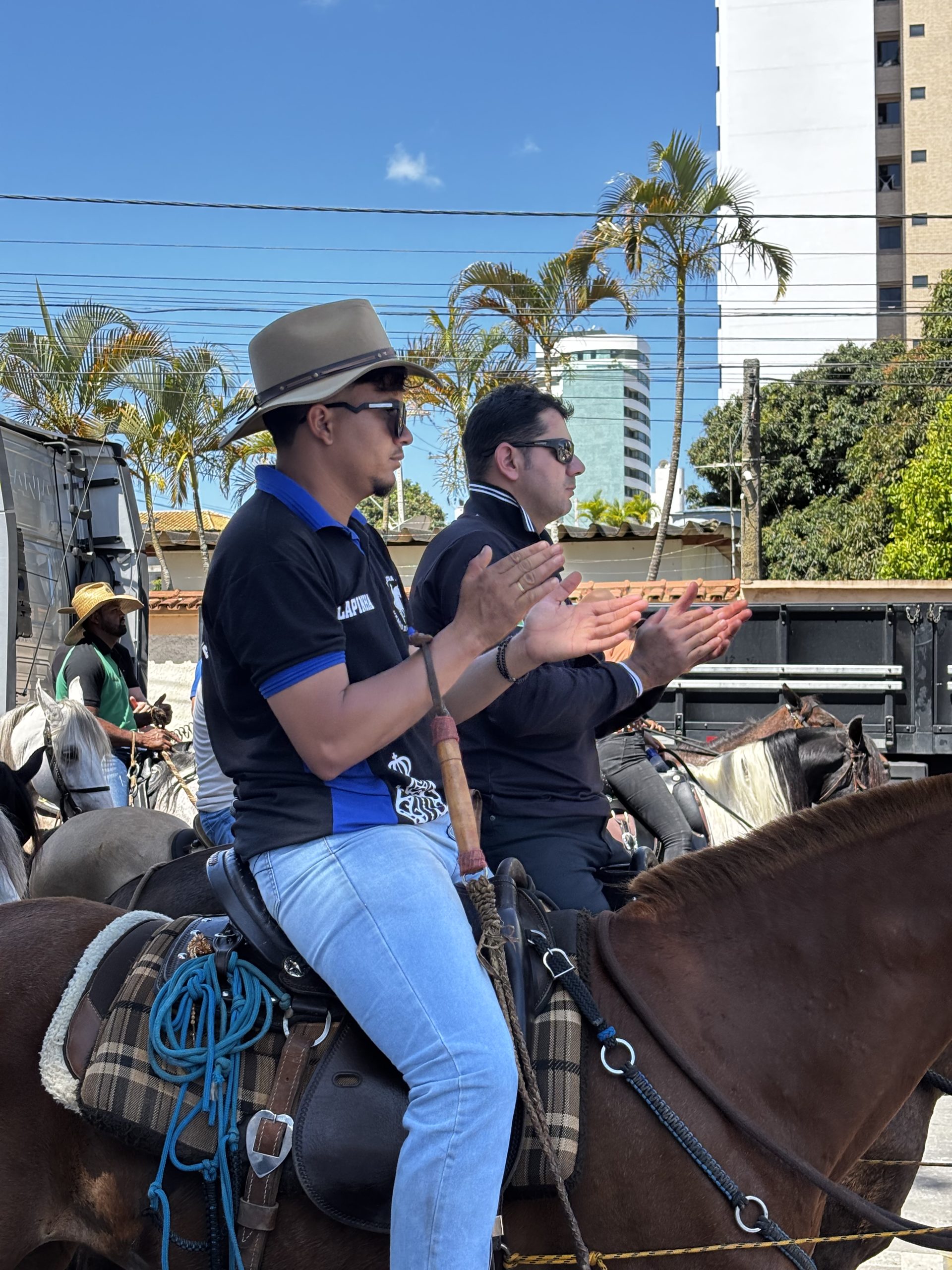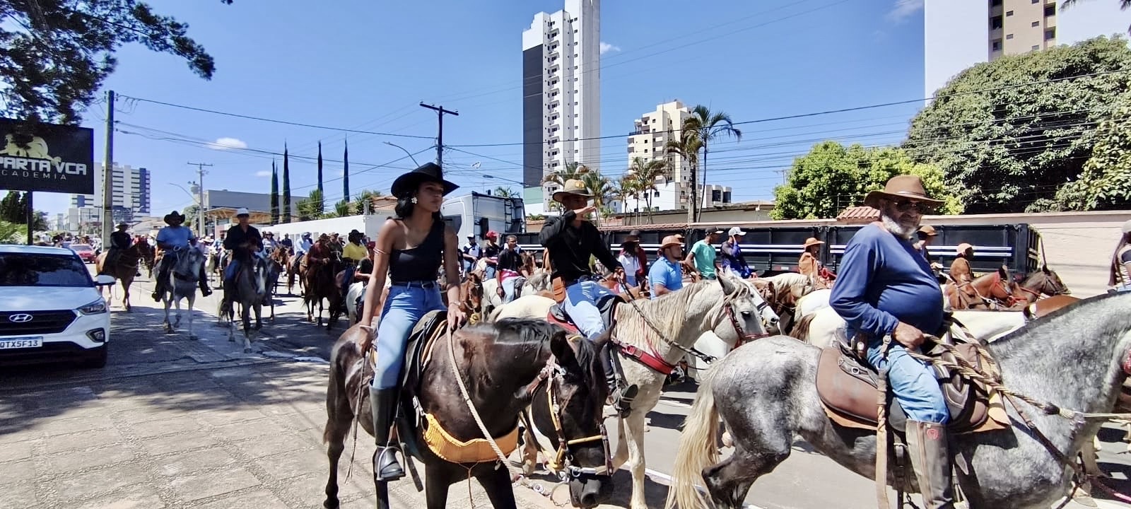 A frente do cortejo era liderada por um trio elétrico, comandado pelo vereador Luís Carlos Dudé, idealizador do evento. Logo atrás, uma multidão de vaqueiros montados em seus cavalos seguia em direção ao Parque de Exposições Teopompo de Almeida, onde a programação festiva continua ao longo do dia.