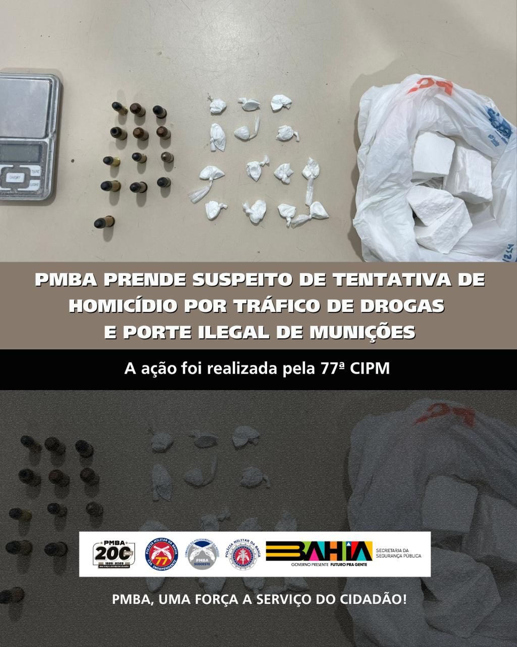 O Pelotão de Emprego Tático Operacional (PETO) da 77ª CIPM prendeu um homem suspeito de uma tentativa de homicídio e o flagrou com drogas e diversas munições, na madrugada desta segunda-feira (03), em Vitória da Conquista.