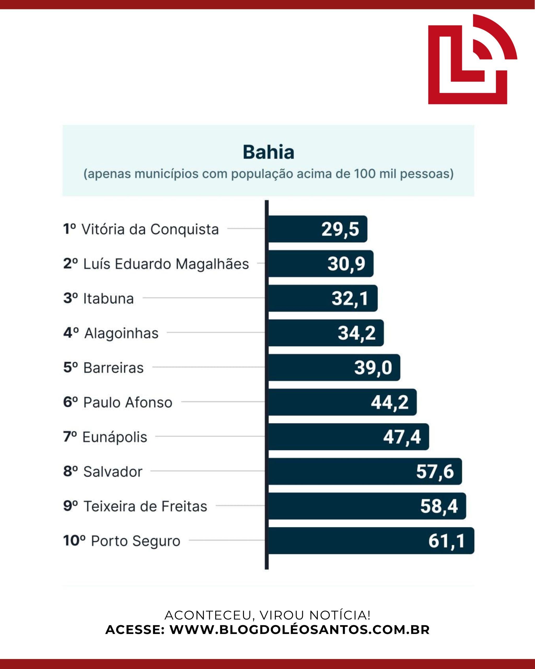 Esses dados são reforçados por outras pesquisas. Em julho deste ano, a própria Secretaria da Segurança Pública da Bahia (SSP-BA) já havia confirmado Conquista como a cidade mais segura (acima de 100 mil habitantes) no primeiro semestre de 2025. Além disso, o Anuário Brasileiro de Segurança Pública 2025 apontou que a Bahia tem cinco entre os dez municípios mais violentos de todo o país.