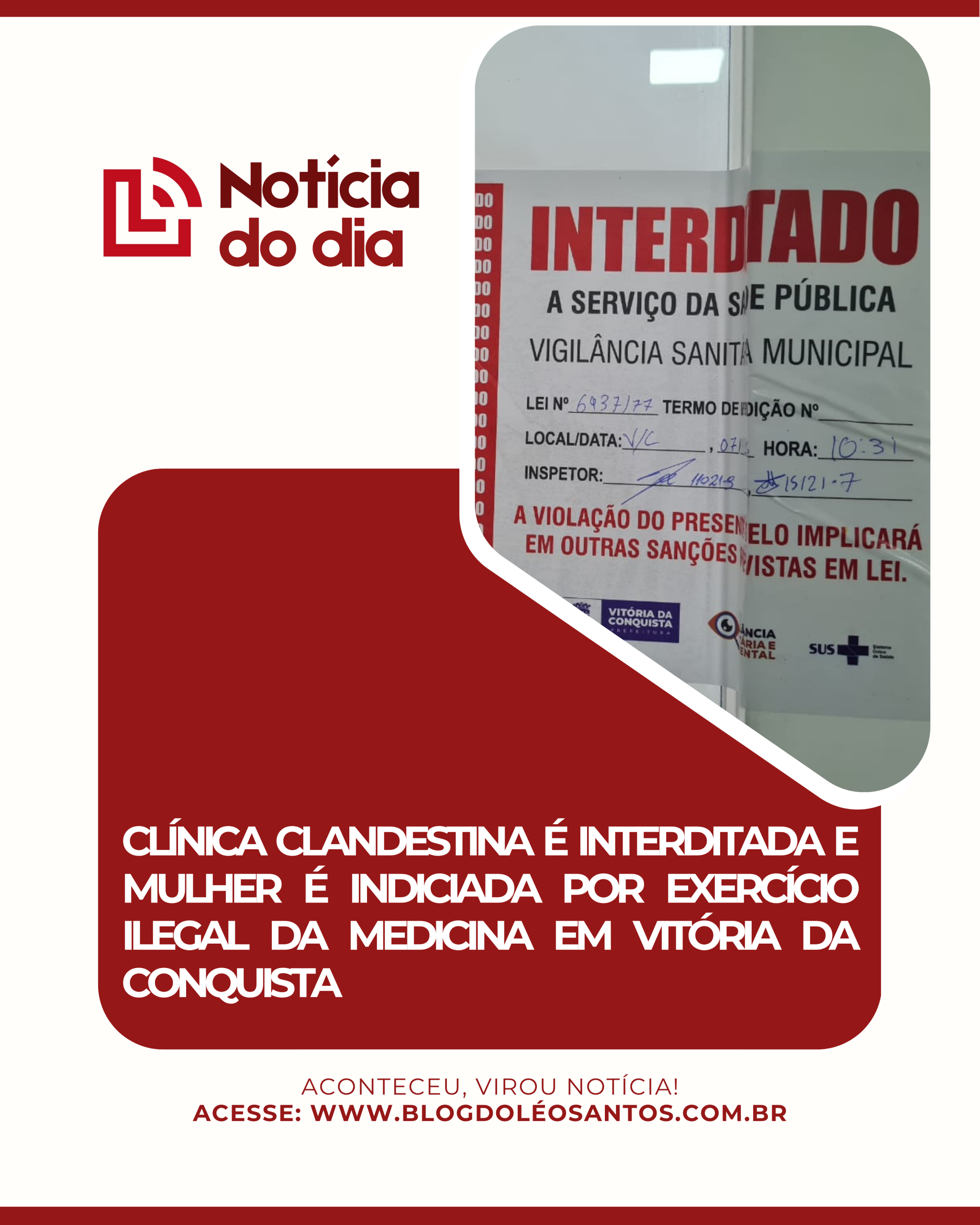 Uma mulher de 44 anos foi indiciada por exercício ilegal da medicina e lesão corporal grave, após uma ação conjunta entre a Polícia Civil da Bahia e a Vigilância Sanitária de Vitória da Conquista, realizada nesta sexta-feira (7). A operação resultou na interdição de uma clínica clandestina localizada na Travessa Adriano Bernardes, no centro da cidade, onde eram realizados procedimentos estéticos sem autorização legal.