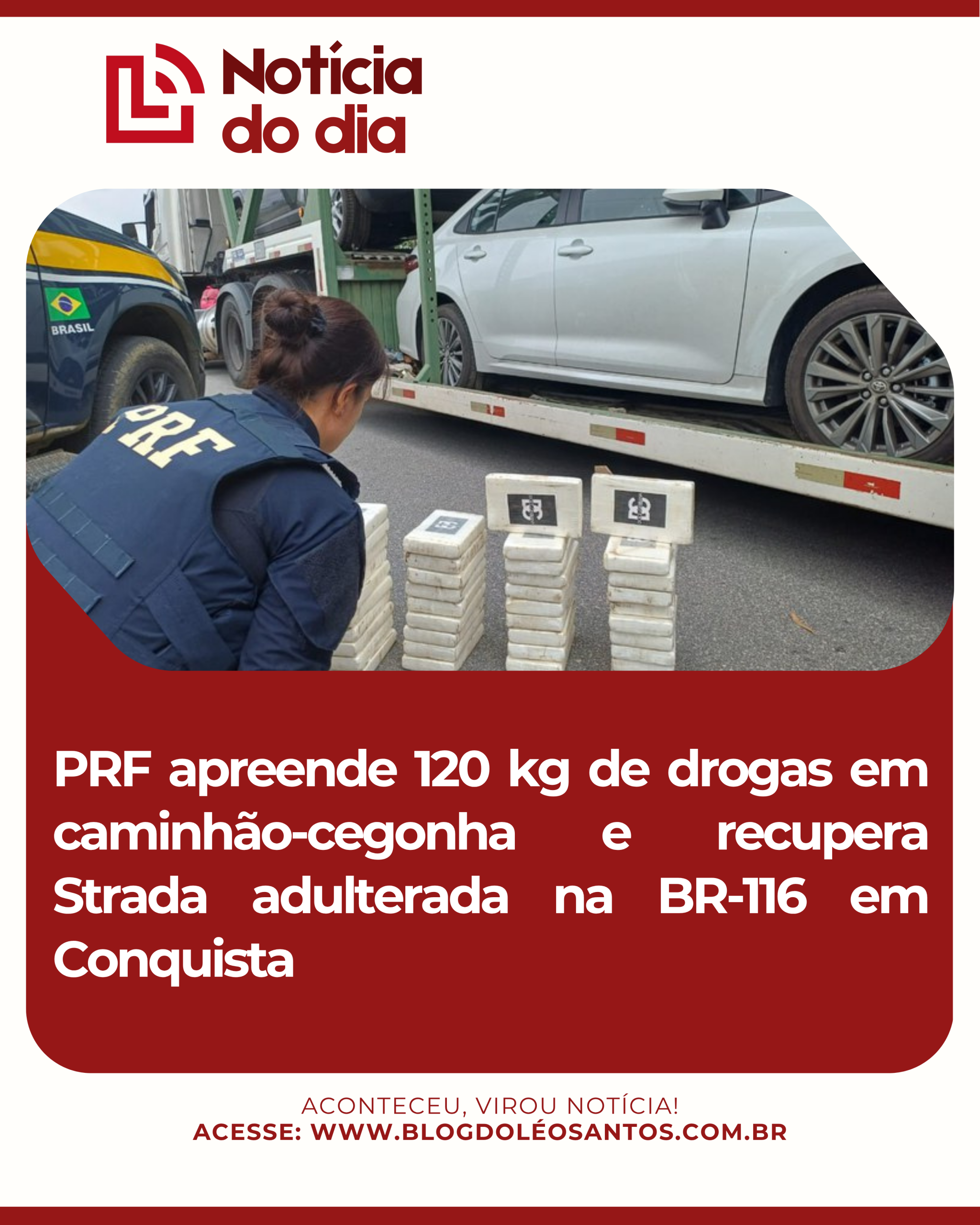 Durante a abordagem a um caminhão-cegonha no km 830 da BR-116, os policiais fiscalizavam a carreta e os veículos transportados. Em um dos automóveis que estava sendo levado pela cegonha, os agentes localizaram 65,5 kg de skunk e 54,5 kg de cocaína, totalizando 120 kg de entorpecentes.