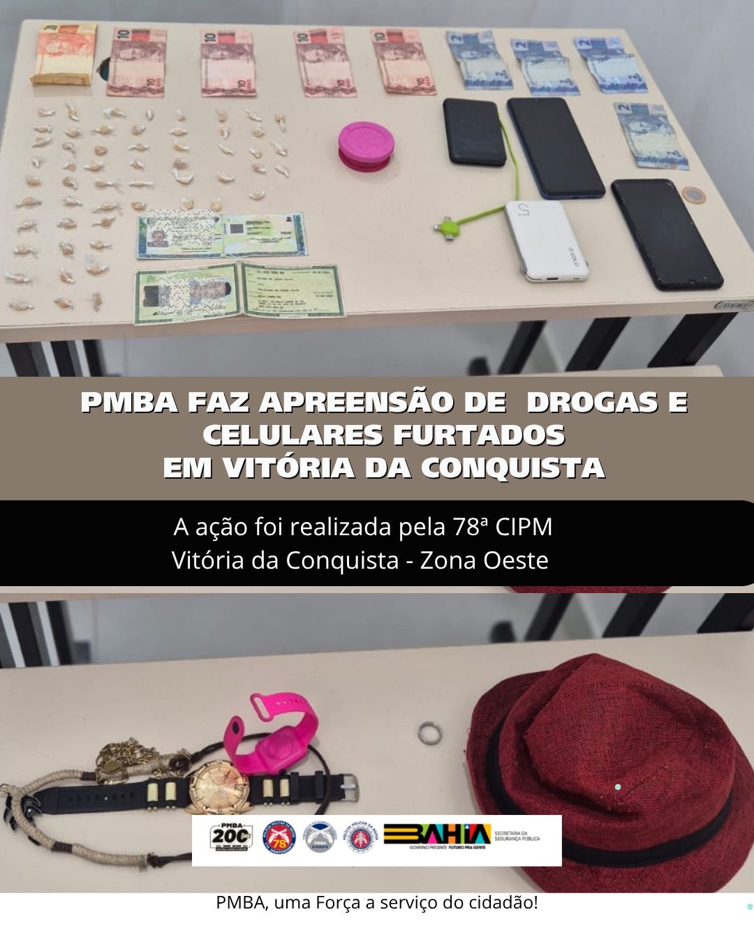 De acordo com informações da 78ª CIPM, uma guarnição de Alunos Soldados realizava rondas na área do Mercado Municipal quando foi abordada por um pedestre. O denunciante informou que um homem e uma mulher estariam comercializando entorpecentes em frente a um posto de combustível, nas imediações do Espaço Cultural Glauber Rocha.