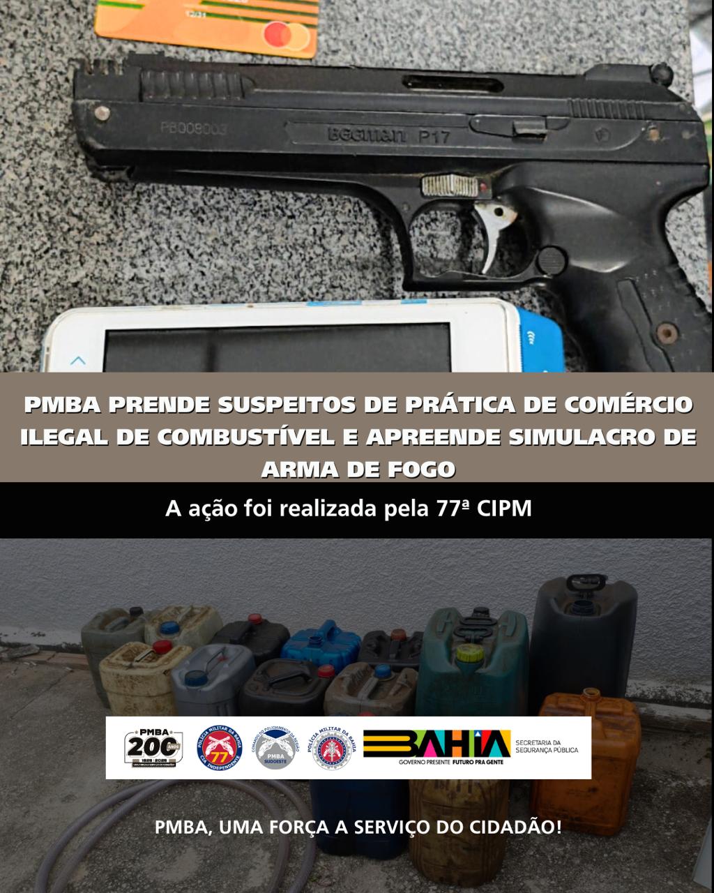 Durante a abordagem, os policiais apreenderam vários galões de combustível, um simulacro de arma de fogo, cartões de crédito em nome de terceiros e uma máquina de cartão, evidenciando possível comercialização ilegal de combustível.