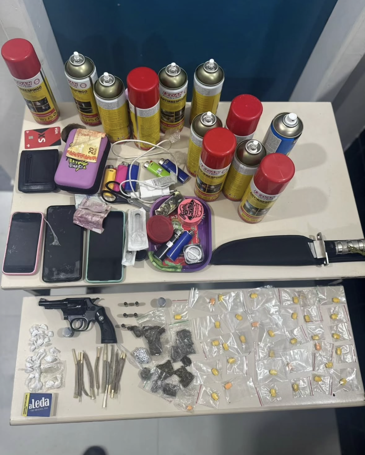 Ao notarem a chegada das viaturas, vários indivíduos fugiram do local, deixando para trás um verdadeiro kit de entorpecentes: 34 comprimidos de ecstasy, 24 porções de cocaína, cigarros de maconha e 13 frascos de loló.