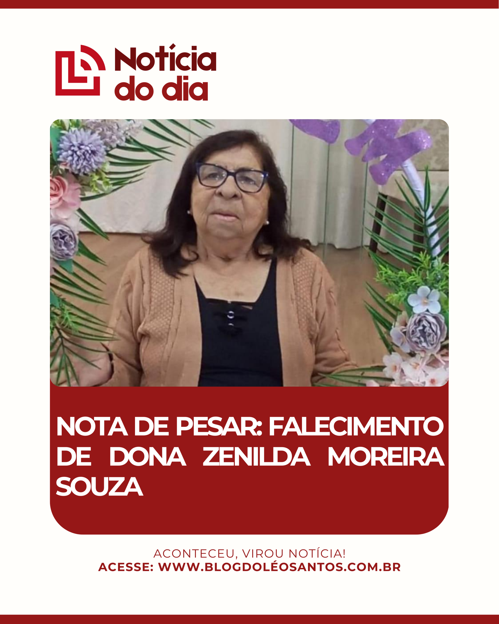 É com profundo pesar que comunicamos o falecimento de Dona Zenilda Moreira Souza, ocorrido ontem no Hospital Geral de Vitória da Conquista (HGVC). Servidora aposentada da Prefeitura Municipal, Dona Zenilda lutava bravamente contra um câncer.
