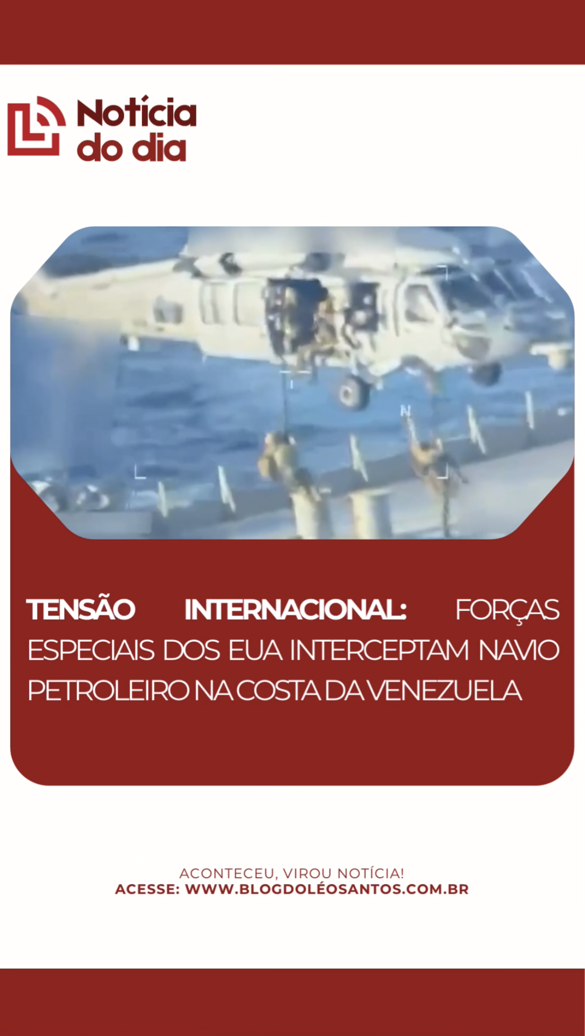 O vídeo registra helicópteros militares sobrevoando a embarcação e militares descendo por cordas para tomar o controle do navio. A operação marca mais um capítulo na tensão geopolítica envolvendo os países.