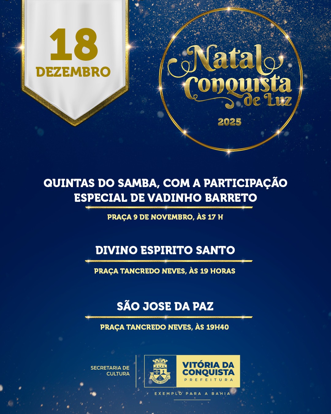 As apresentações culturais do Natal Conquista de Luz começam oficialmente nesta quinta-feira (18) e prometem movimentar o Centro da cidade até o dia 6 de janeiro. A programação vai ocupar as Praças Nove de Novembro e Tancredo Neves.