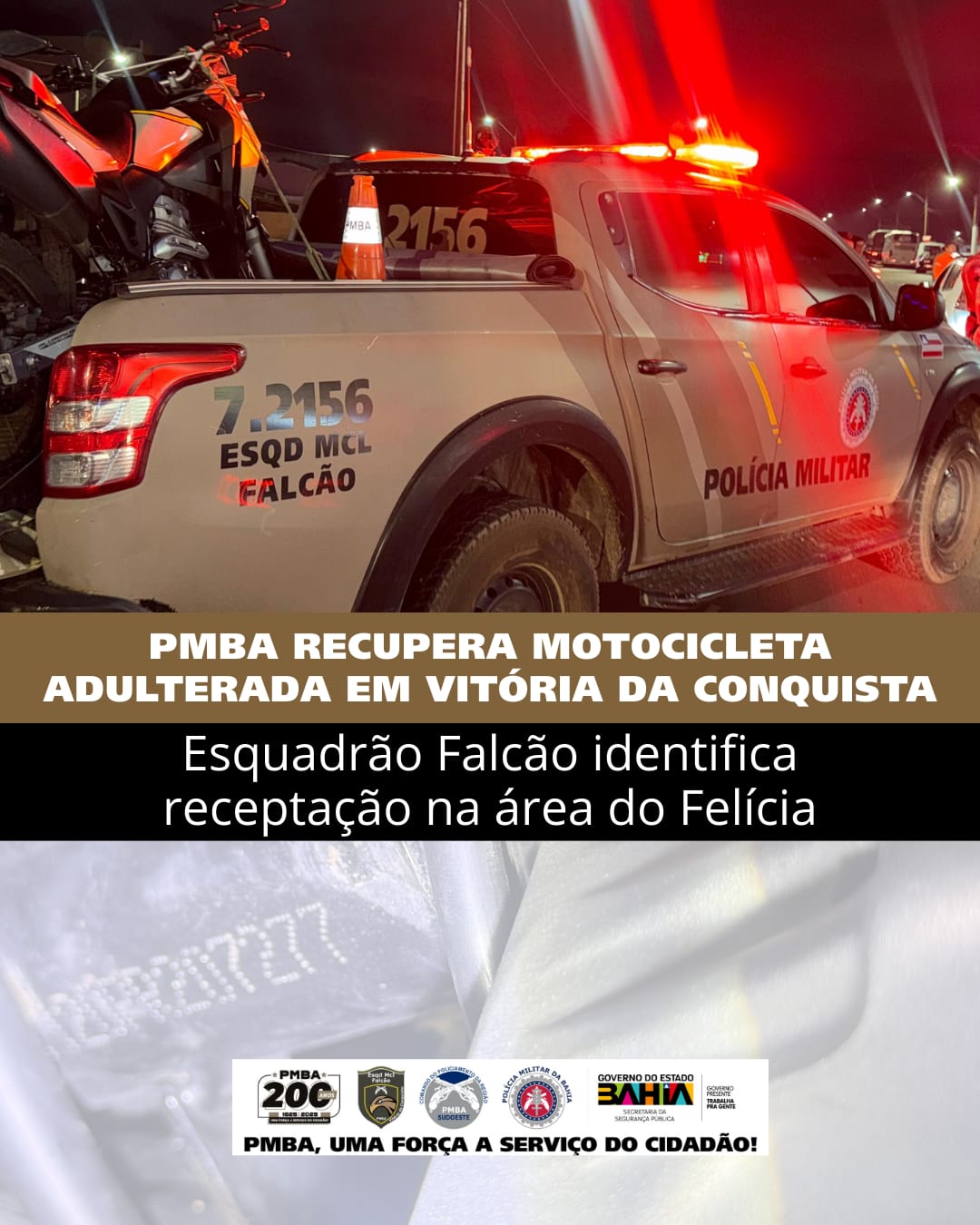 Policiais do Esquadrão de Motociclistas Falcão, da Polícia Militar da Bahia, recuperaram uma motocicleta com restrição de furto roubo na noite desta segunda-feira 22, em Vitória da Conquista.