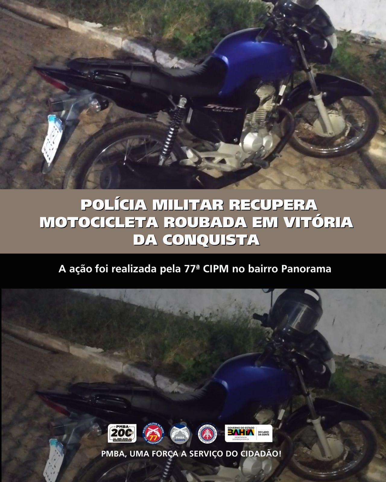 A noite desta terça-feira (13) foi marcada por uma resposta ágil da Polícia Militar em Vitória da Conquista, evitando que mais um cidadão ficasse no prejuízo. Por volta das 21h, uma guarnição da 77ª CIPM conseguiu recuperar uma motocicleta que havia acabado de ser roubada no bairro Panorama.