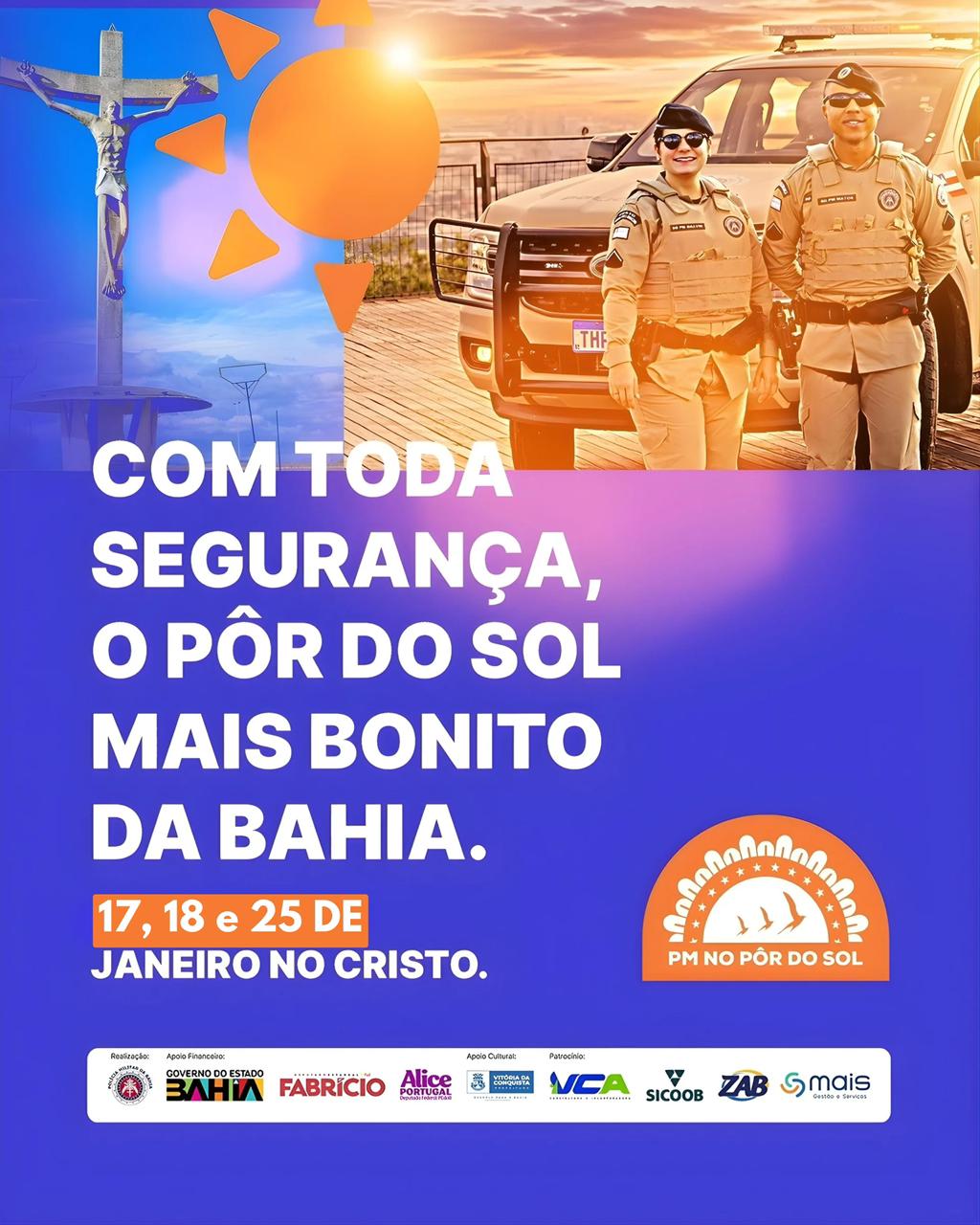 A Polícia Militar da Bahia, através do Comando de Policiamento da Região Sudoeste (CPR-SO), preparou uma programação especial para quem quer curtir um dos cartões-postais mais bonitos de Vitória da Conquista. Nos dias 17, 18 e 25 de janeiro, sempre a partir das 15h, acontece o Projeto PM no Pôr do Sol.