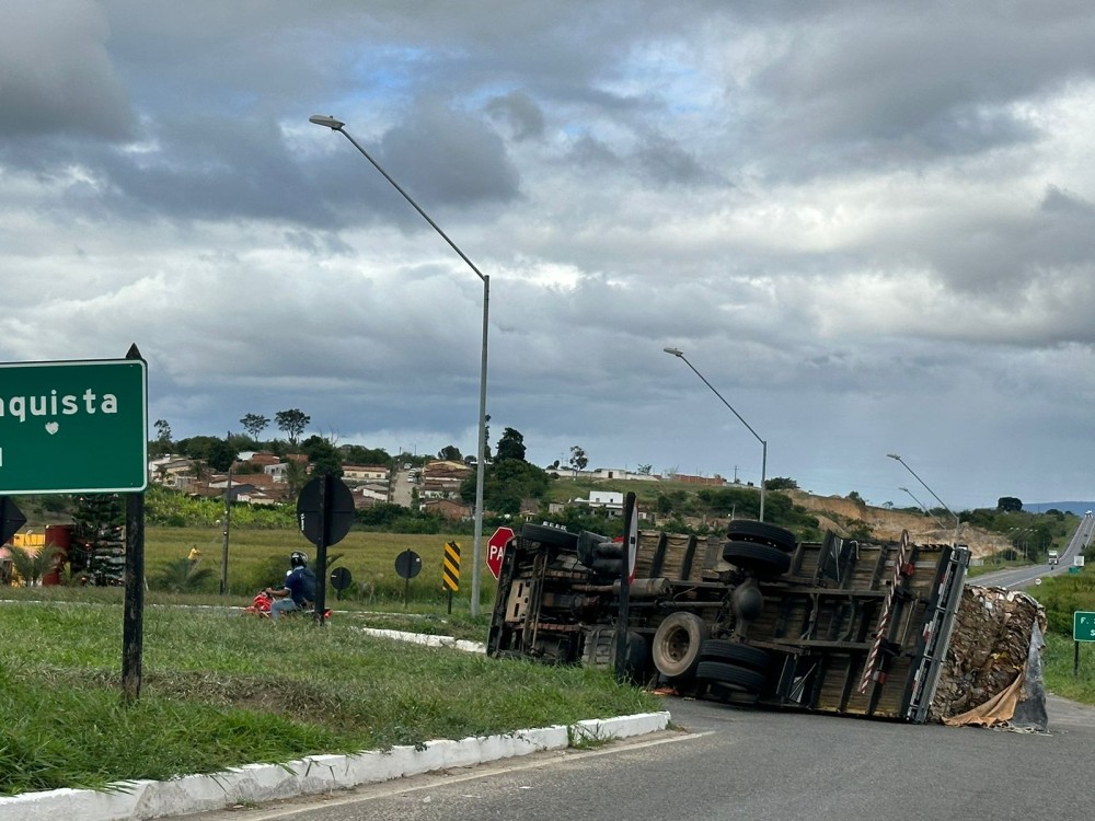 Um caminhão-baú que transportava uma carga de papelão tombou na tarde desta quinta-feira (15) em um cruzamento da BR-116, no trecho urbano do distrito Stela, conhecido como Entroncamento de Jaguaquara, no sudoeste da Bahia.
