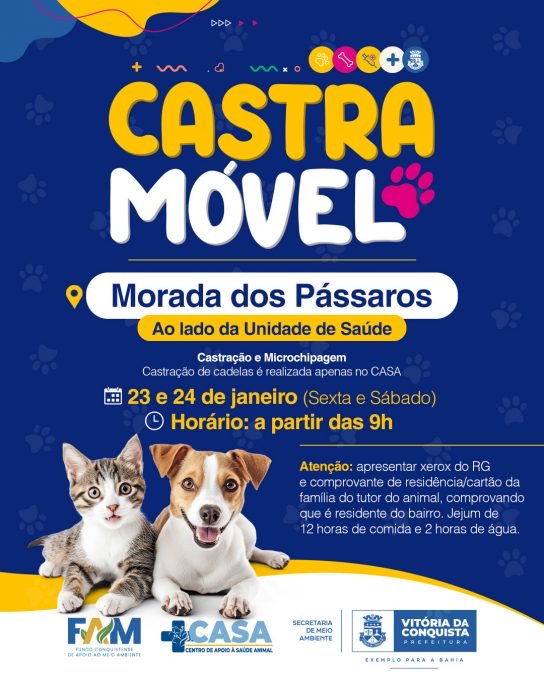 Uma excelente oportunidade chega para os donos de cães e gatos do loteamento Morada dos Pássaros e região. Nesta sexta-feira, dia 23, e no sábado, dia 24, a unidade itinerante do Castramóvel estará no bairro realizando castrações gratuitas.