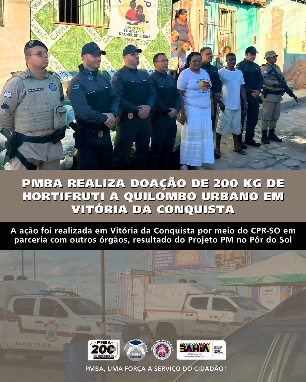 E o Projeto PM no Pôr do Sol não para. Na tarde de ontem (23), foi realizada a entrega de aproximadamente 200 quilos de hortifruti ao Kilombeco, quilombo urbano localizado no bairro Cruzeiro, área onde acontece o Projeto PM no Pôr do Sol, em Vitória da Conquista.
