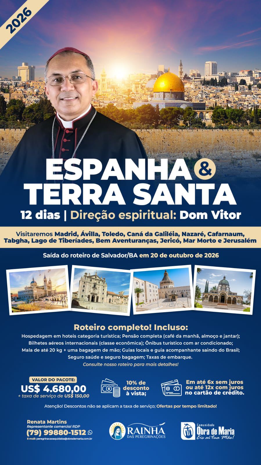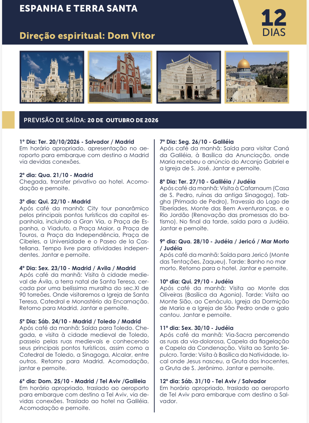 A viagem, com saída prevista de Salvador/BA no dia 20 de outubro de 2026, promete ser uma experiência transformadora. O roteiro começa pela Espanha, visitando Madrid, a cidade medieval de Toledo e Ávila (terra natal de Santa Teresa).