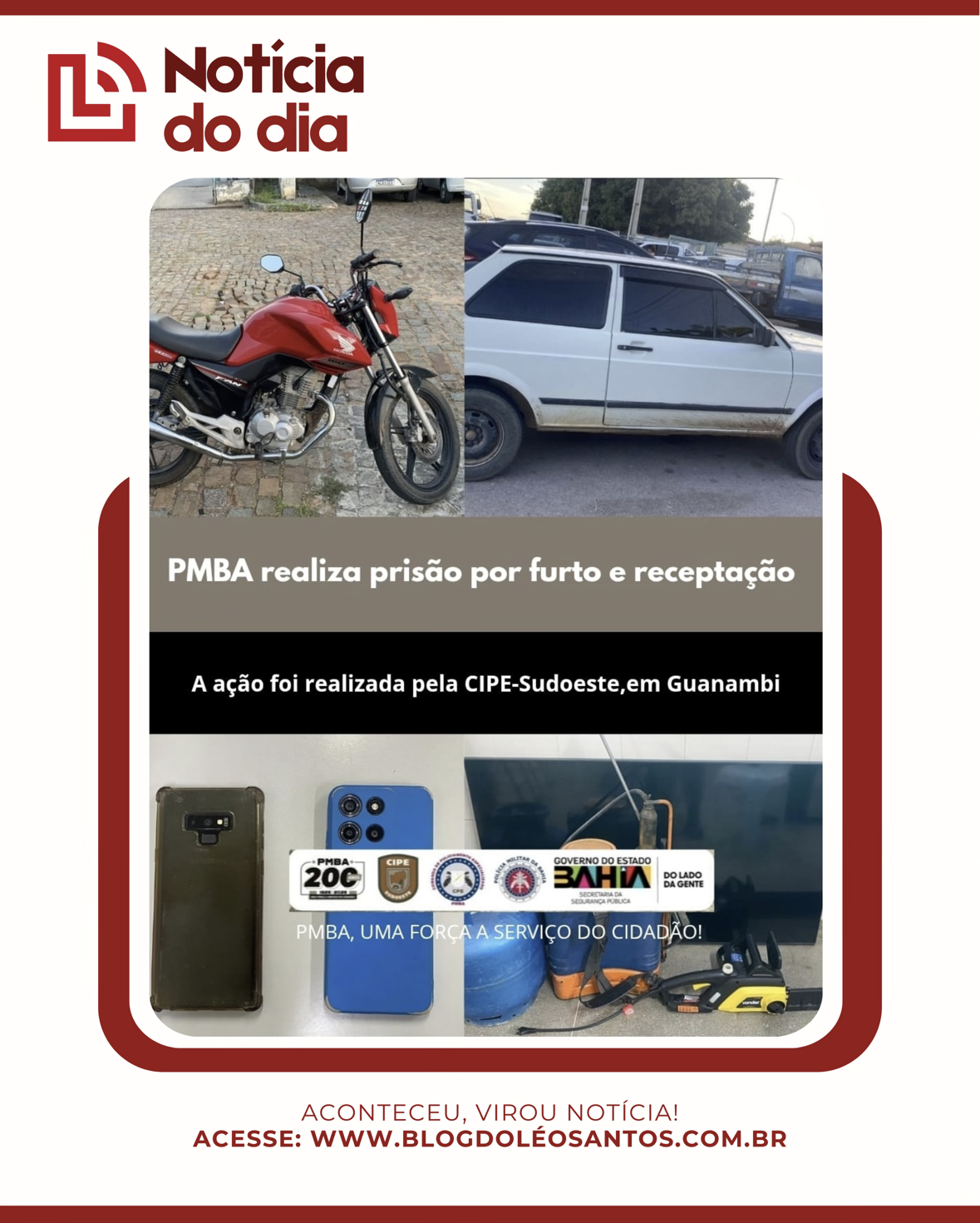 Dois indivíduos foram presos e conduzidos à Delegacia. Durante a ação, a polícia apreendeu os veículos usados na logística do crime (um VW/Voyage branco e uma moto Honda CG Fan 160) e recuperou diversos bens das vítimas, incluindo: