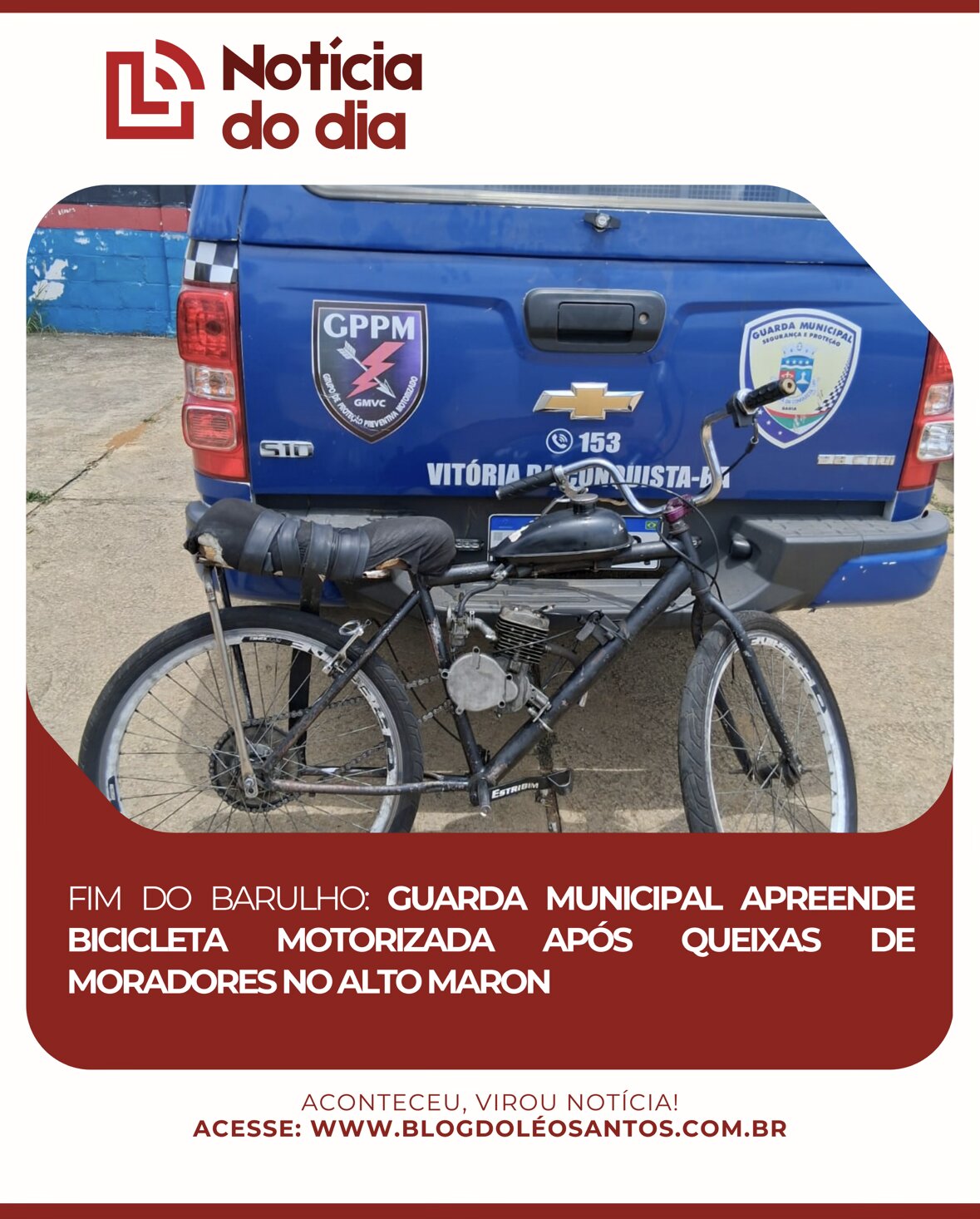 A perturbação do sossego tirou a paciência de moradores do bairro Alto Maron e resultou em ação da Guarda Municipal de Vitória da Conquista. Após receberem denúncias anônimas via telefone, os agentes foram averiguar a situação de um jovem que estaria causando transtornos na região com uma bicicleta motorizada.