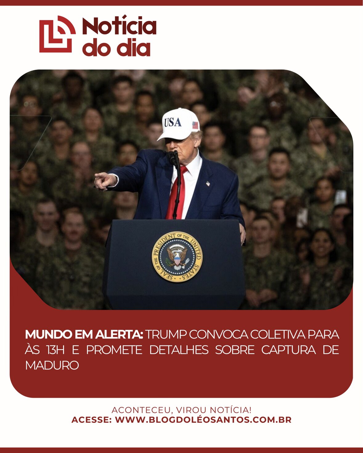 Após confirmar a realização de uma operação militar histórica na América do Sul, o presidente dos Estados Unidos, Donald Trump, prepara-se para falar ao mundo. O líder norte-americano agendou uma coletiva de imprensa para às 13h (horário de Brasília) deste sábado, onde apresentará os detalhes da ação.
