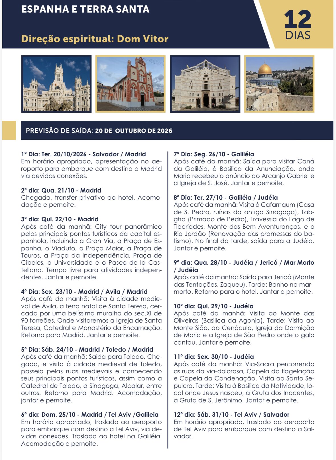 A viagem, com saída prevista de Salvador/BA no dia 20 de outubro de 2026, promete ser uma experiência transformadora. O roteiro começa pela Espanha, visitando Madrid, a cidade medieval de Toledo e Ávila (terra natal de Santa Teresa).