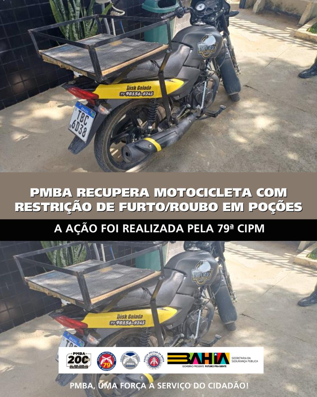 Uma motocicleta com restrição de furto/roubo foi recuperada pela Polícia Militar na cidade de Poções, nesta quinta-feira (5). A ação foi realizada por uma guarnição da 79ª CIPM durante rondas preventivas na zona urbana.